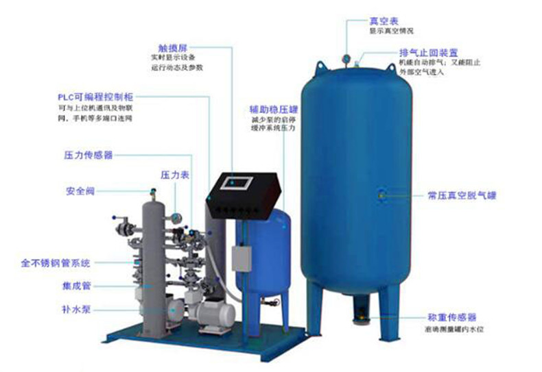 自动补水定压装置的作用: ⑴ 定压——使循环系统内压力恒定在用户设定的压力范围内,循环系统内的水体体积因温度的升降而胀缩,而循环系统容纳水体的体积近乎是不变的,这**导致了系统压力的升降,影响系统的正常工作,利用定压设备可以因温度变化的影响,保证系统压力恒定保证系统的正常工作。 ⑵ 补水——当循环系统发生泄漏时及向系统补水,泄漏一般分为少量泄漏和大量泄漏,当少量泄漏时,设备自动选择增压泵从脱气罐抽水补充,使系统压力恒定;当大量泄漏时,设备自动选择从系统外(如自来水或软水水箱)补水进入脱气罐,然后增压泵从脱气罐抽水补充,使系统压力恒定。当脱气罐的贮水量少于设定值时,自动从系统外补给(如自来水或软化水)。