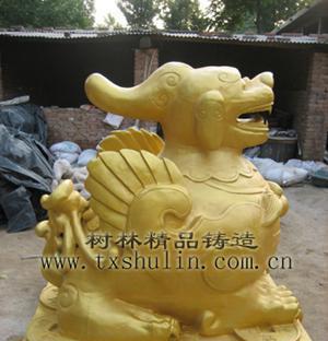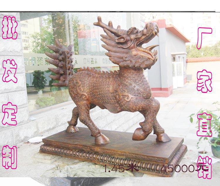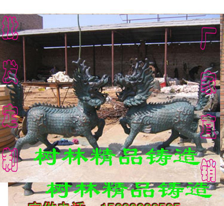 2008年我厂为邯郸市武安县白沙五龙宫铸造青铜麒麟一对,该该麒麟参照香河天下**城麒麟制作。高度2.7米总重量3吨材质青铜浇铸而成做工极好深得客户满意该产品主要用在饭店宾馆乔迁广场学校企业庆典博物馆公园企业等