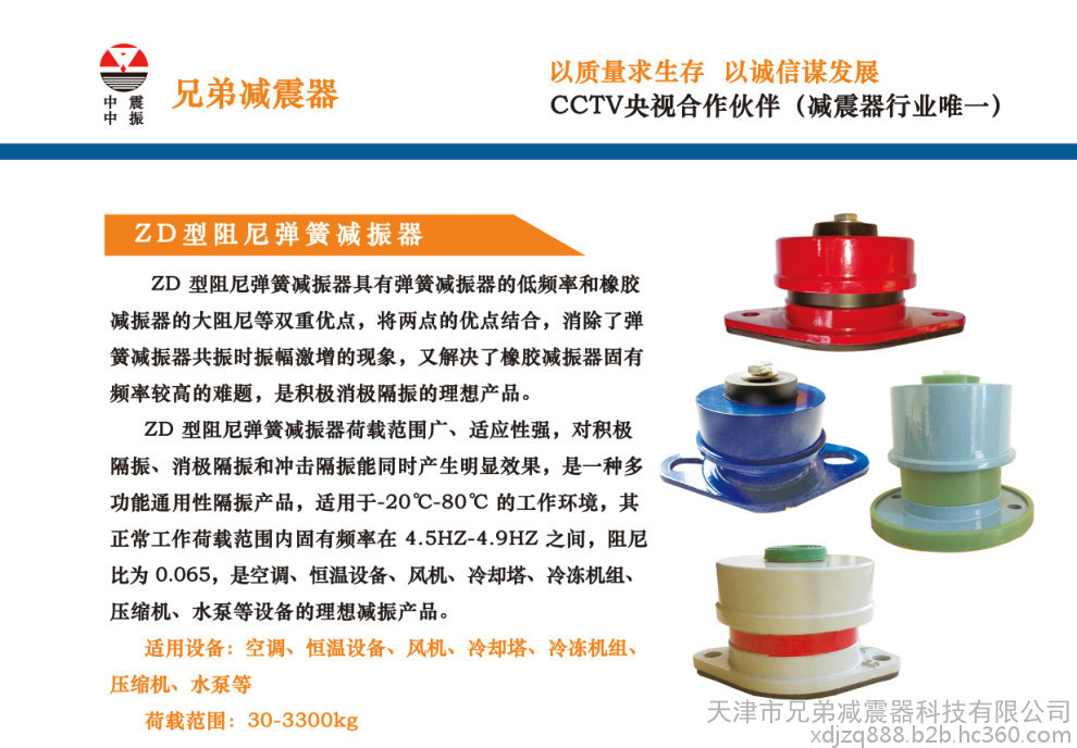 天津市兄弟减震器科技有限公司主要致力于吊式弹簧减震器(减振器)、阻尼弹簧减震器、橡胶减震器、管道减震器、新型阻尼减振器等产品的研制生产,是国内生产大型弹簧减震器的专业制造商,产品广泛用于中央空调、通风管道、钢铁、发电、石化、水泥和城市供热等行业的各类管道和设备上,并在全国 31 个省市自治区的重点工程上得到应用,业绩遍布全国各地,深受用户信赖. 公司主导的减振器系列产品有:中央空调系列减振器、泵房系列减振器、管道系列减振器、风机系列减振器、以及自行设计制作的系列隔振台座。天津市兄弟减震器科技有限公司拥有 40 多名中技术人员,技术力量雄厚,开发和研制了弹簧减震器生产和检验专用设备,拥有硅橡胶自动挤出生产线, 25-300 吨硫化机,全自动弹簧机等设备。生产条件日臻完善,努力扩大生产规模,塑造天津市兄弟减震器科技有限公司公司生产竞争力。 多年来,天津市兄弟减震器科技有限公司各种弹簧、橡胶、非金属、金属减震器产品以其稳定的质量和服务被不同工况的各个领域广泛采用。 另外,天津市兄弟减震器科技有限公司已顺利通过ISO9000:2000国际质量体系认证。 天津市兄弟减震器科技有限公司一直致力与新产品的研究与开发,客户满意-企业的发展是我们每一位员工的心愿。 欢迎新老客户前来洽谈业务,我们将真诚的为您服务!!! 诚招各空白省,市代理商。
