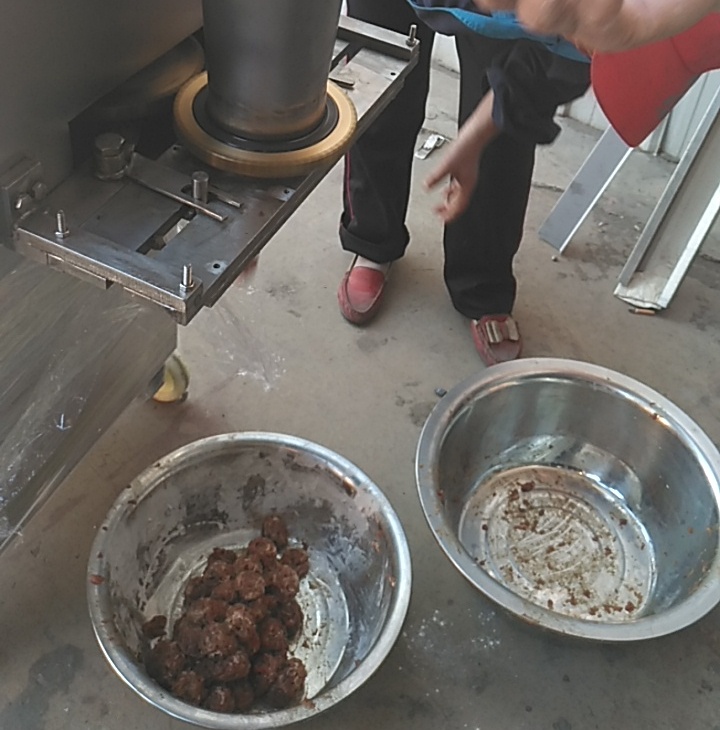 机器主要:有机架、切刀组合、成型齿轮组和、料斗、转盘组合、润滑水路组合、传动系统等组成。该机接触食品的零部件均采用不锈钢和有色铜合金材料制成,符合食品卫生要求,便于清理。外部护板均采用不锈钢材料,外型美观,耐腐蚀。 每套丸子成型机免费配备三套模具,丸子直径15-30可以调节,成型圆度好。