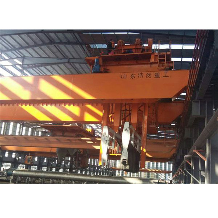 夹钳装置是天车实施对阳极炭块进行夹持装炉、出炉及运送的工作机构,该夹钳每次可夹7块,承担炉室至编组站之间的往返运送。该夹钳为机械式自动夹具,通过巧妙的机构,夹钳仅靠自身的重量和被夹阳极的重量的共同作用即可将阳极夹紧,完全不需另配夹紧动力源。 采用PLC的联锁控制来保证夹具在未将阳极放置于固定的平面上时处于自锁状态,夹具不能被打开,以防止操作人员误动作等而发生事故。用电子传感器进行过载保护,在阳极因层间发生粘连或夹具提示出现卡阻而导致提示提升过载时,对提升装置或相关机构进行保护。桥架主梁采用箱形结构,保证其强度、刚度及稳定性。桥架上安装小车供电用的电缆托车。桥架行走导轨、滑触线保证吸料天车行走稳定,可靠运行。小车架是由经过预处理后的板材对焊接而成。包括栏杆等在内的小车架组件的设计、制造均按标准《GB/T14405-2000通用桥式起重机》执行。