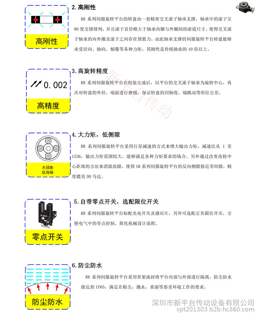 深圳市新平台传动设备有限公司是目前国内专业研发、生产、销售精密伺服旋转工作台的企业。所生产的伺服旋转平台以超重载、高旋转精度,低侧隙为特点,其产品类别包括同轴型,旁轴型,直角型三种结构形式,主要适用于机械手臂、数控转台、对位机构、军工雷达、自动化及测量和试验中要求精度高的领域。