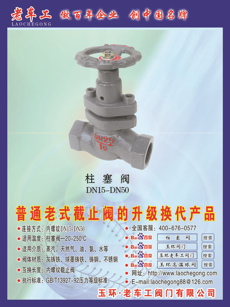山东省聊城市玉环老车工阀门有限公司(原浙江省玉环老车工阀门厂),老车工牌商标经**工商总局03年10月批准的以制造老车工牌柱塞阀、高温球阀、卧立两用消音止回阀的专业企业,并在北京、天津、上海、江苏、哈尔滨、乌鲁木齐、西安、广州、等各城市设立直销部,为了方便客户,降低成本特在山东设立分厂(山东省聊城市玉环老车工阀门有限公司)拥有国内先进的生产检测设备及雄厚的技术力量,工厂严把质量关,从铸造、加工、检测都由专业的技术人员管理使产品**合格,并经过北京市建设工程质量检测中心检测,连续启闭2万次仍无泄漏,使用寿命是普通截止阀、闸阀的六倍以上。 老车工阀门具有结构合理,造型美观,操作简单,使用寿命长等特点,也是截止阀、闸阀、排污阀的升级换代产品。老车工阀门以其超群的产品质量和优良的售后服务赢得了客户的赞誉,产品行销全国各地,广泛适用于电力,化工、天然气、煤气、石油、机械、纺织、橡胶、造纸、医疗、食品、轻工等行业及现代建筑。是杜绝“跑、冒、滴、漏”的**产品。 为方便客户,我厂在全国各地设有技术服务部。竭诚欢迎新老客户前来参观考察指导,携手合作,本厂将以**的产品,优惠的价格,良好的售后服务高效率为您服务。
