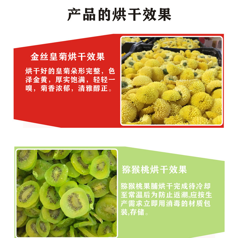 | 鲜果干:葡萄干、猕猴桃干、芒果干、荔枝干、桂圆干、杏干、李干、柿饼、香蕉、蜜枣、杨梅、柠檬、菠萝、奇异果、橄榄、果脯、龙眼等鲜果干制品的烘干和干燥。 |