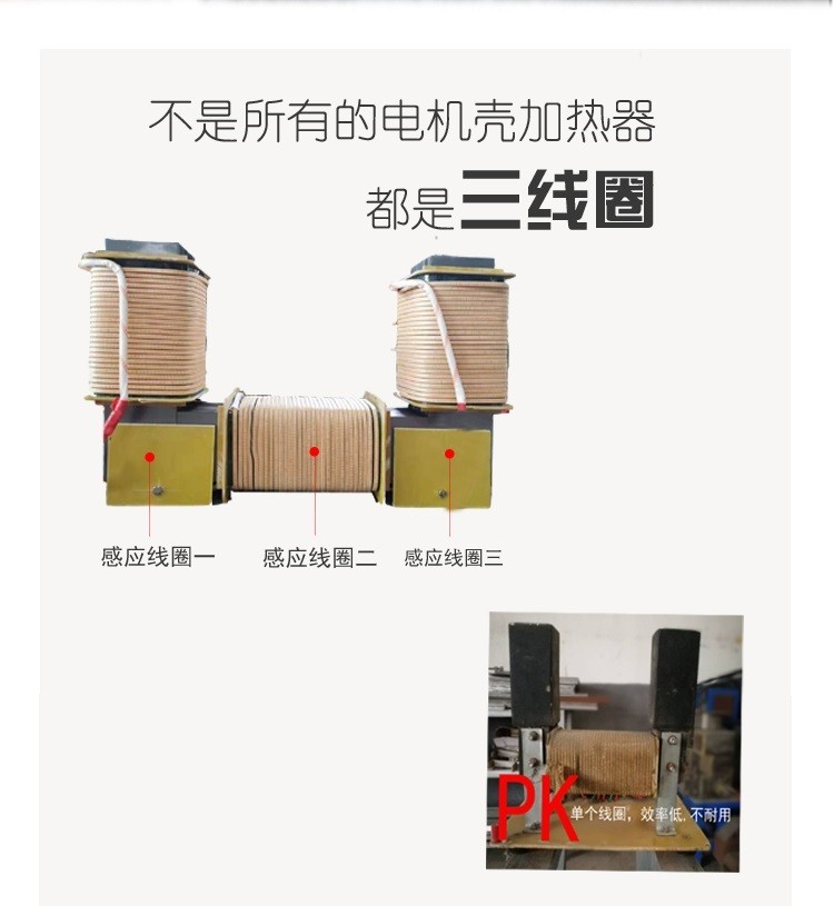江川电机加热器三组感应线圈产生的电磁场,是一组感应线圈的3倍,加热效率相当于一组线圈的三倍.一台顶三台用.