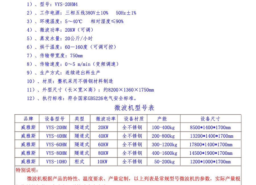 威雅斯公司生产的食品微波加热设备 肉制品微波加热设备 果酱微波加热设备是非标设备,烘干机尺寸根据用户对需要加热的物料的体积和数量定做,功率根据用户的加热速度要求定做,范围在15千瓦至200千瓦。设有温度监测控制,传输速度控制,照明,功率调节等功能,PLC自动控制是可选功能。根据你们的应用需求,我们会给你们制定相应的应用方案,研制各种型号的设备。我公司对设备质量实行“三包”承诺,负责免费安装调试,现场培训操作及维护,一年保修,终身服务。