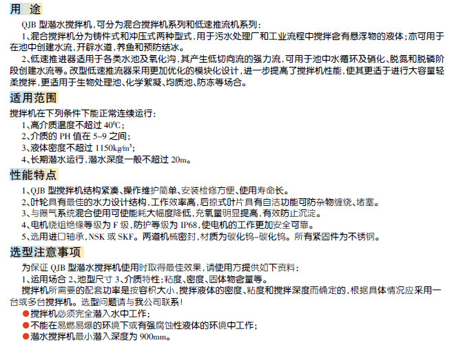 用途及适用范围 混合搅拌系列搅拌机适用于污水处理厂和工业流程中搅拌含有悬浮物、固杂物的液体。 低 速推流系列搅拌机适用于工业和城市污水处理厂曝气池和厌氧池,其产生低切向流的强力水 流,可用于池中水循环及硝化、脱氮和除磷阶段创建水流等。潜水搅拌机主要适用范围: