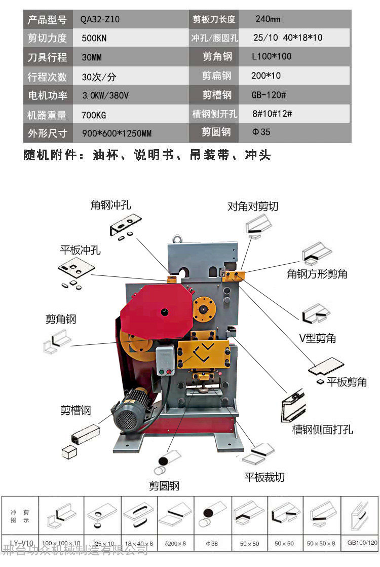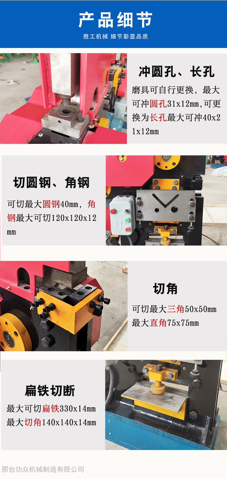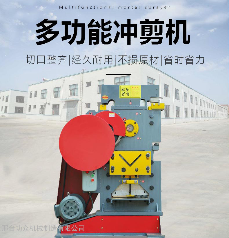 多功能联合冲剪机本机适用于剪切方钢、角钢、扁钢、钢板,也能对角钢和钢板进行异性加工和冲孔。特别适用于机械、建筑、电力、轻工、船舶、钢结构,机械加工等行业的钢材下料。具有省电,功率大、体积小、结构紧凑、操作灵活、一机多用、自动小型冲压机使用及维修方便等特点。