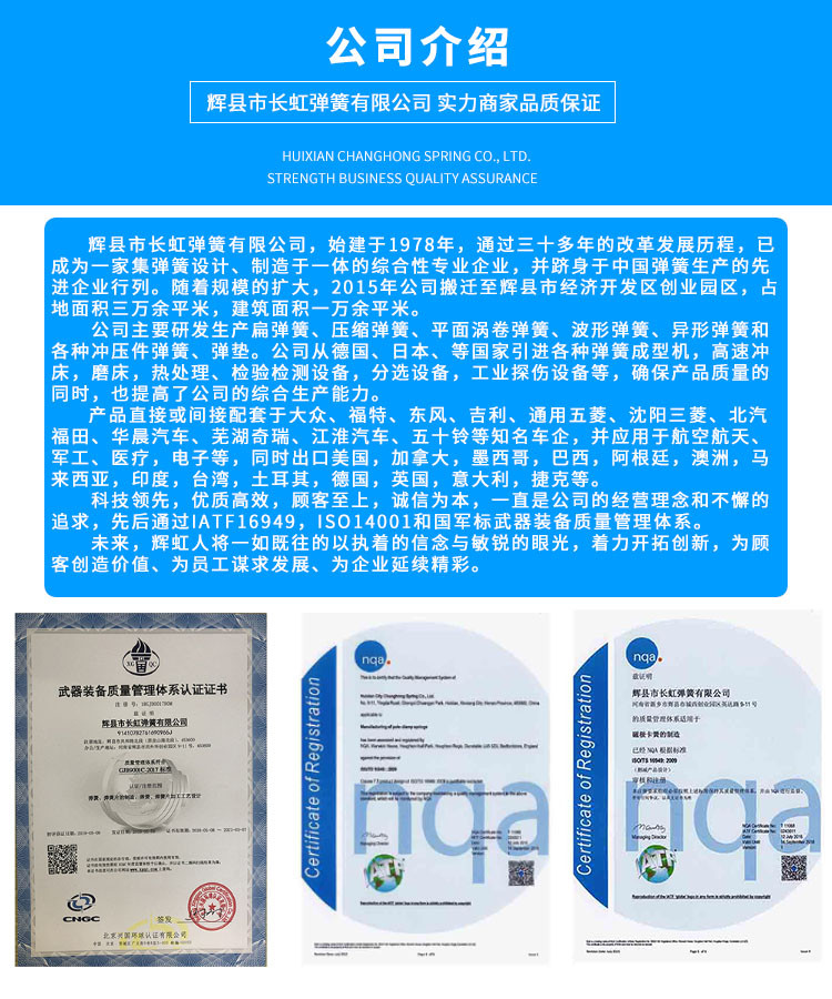 本网页所展示的有关【长虹 异形弹簧 扭簧异型弹簧_异形弹簧_辉县市长虹弹簧有限公司】的信息/图片/参数等由弹簧网的会员【辉县市长虹弹簧有限公司】提供,由弹簧网会员【辉县市长虹弹簧有限公司】自行对信息/图片/参数等的真实性、准确性和合法性负责,本平台(本网站)仅提供展示服务,请谨慎交易,因交易而产生的法律关系及法律纠纷由您自行协商解决,本平台(本网站)对此不承担任何责任。您在本网页可以浏览【长虹 异形弹簧 扭簧异型弹簧_异形弹簧_辉县市长虹弹簧有限公司】有关的信息/图片/价格等及提供【长虹 异形弹簧 扭簧异型弹簧_异形弹簧_辉县市长虹弹簧有限公司】的商家公司简介、联系方式等信息。