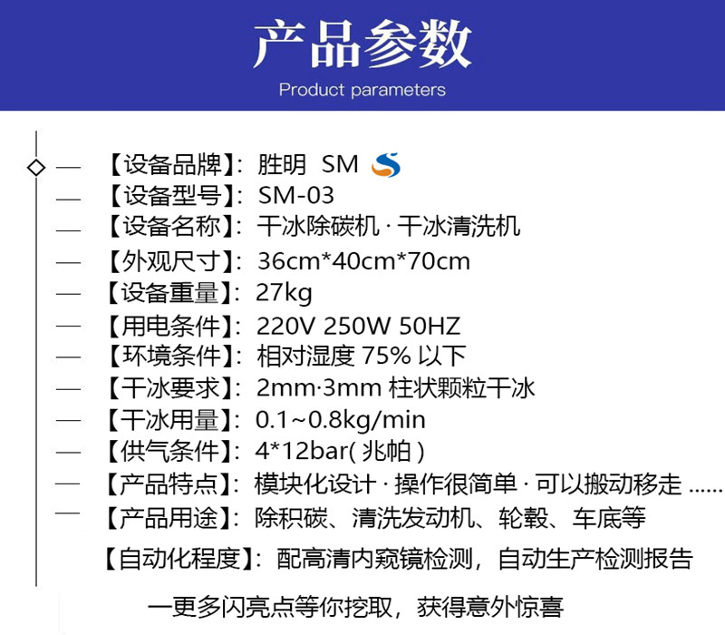 如何清洗积碳这个问题是现如今很多企业、工厂的难题,但现在4S店利用干冰来清洗发动机积碳,因为干冰清洗积碳非常适合解决发动机积碳残留问题,效果超过所以清洗积碳的方法,干冰清洗积碳具有耗时短,成效快,是现如今很多汽车4S店所必备“神器”。 重庆干冰清洗 发动机舱清洗 干冰请这么清洗发动机舱 SM-03干冰除碳清洗机直销我们都知道干冰清洗主要的原材料**是干冰颗粒,胜明SM-03干冰除碳机的干冰颗粒是二氧化碳气体经过高压强冷凝加压而形成的,干冰的物理特性是升华,直接从固体颗粒升华成二氧化碳气体,期间没有任何水分的产生,这正是清洗发动机积碳的主要优势之一**不用担心干冰对发动机内部造成任何的损害。
