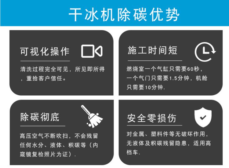 发动机燃烧室干冰清洗单个只需3分钟,积碳随干冰气雾化,直接排出发动机外,无任何残留,不会有拉缸隐患。