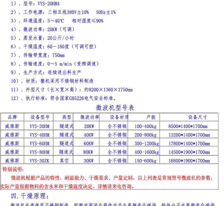 总用电功率:≤30~300KVA 微波功率:20~200KW脱水效率:20~200公斤/小时 材质:全不锈钢
