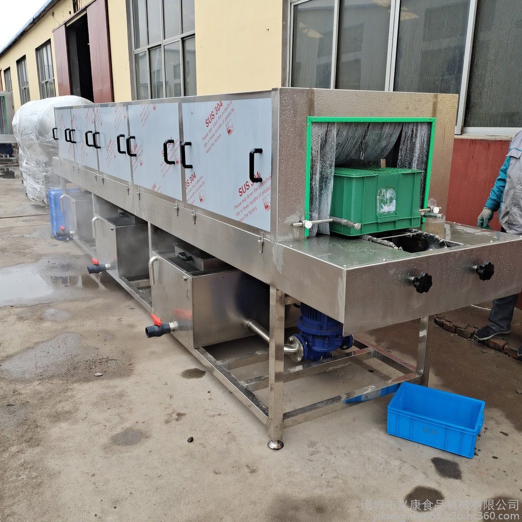 洗筐机的工作原理:1. 食品筐清洗机一高压喷淋冲洗为主要清洗方式,以约80℃热碱水为主要洗涤剂,以约80℃热水为主要清洗力进行清洗;2.周转筐清洗机 设备有热碱水喷淋段、热水喷淋段、清水喷淋段、消毒水喷淋段、烘干段等几部分组成,其中消毒水喷淋段及烘干段可根据客户要求定配。3.洗筐机 消毒水箱内消毒液由人工调好浓度后滴加,碱水箱及热水箱内分别设有蒸汽加热管或电加热管;两水箱内水温自动控制,常温至80℃任意设定。4. 洗筐机各个循环水箱均采用卧式不锈钢离心水泵循环喷淋,从上、下、左、右四个方向同时对筐子进行喷淋冲洗;每个水箱均设有二道过滤装置,便于随时清理赃物;各个水箱设单排污清理阀,排出后有截管同一排放。洗筐机简介:1.该产品主要由输入、预洗、主清洗、漂洗、及输出部分组成;2.使用标准组合式清洗系统非常灵活,可根据用户的要求进行组合;3.合理的水路设计,达到节水,耗水量仅为500L/小时;4.预洗水箱、主清洗水箱设有蒸气加热及温控装置,以便调节水温达到 清洗效果;5.输送装置采用变频调速,输送链速0.7—7 米/分可调整,以满足不同条件下的清洗要求;洗筐机工作时:需清洗的周转筐由不锈钢链条输入清洗机中,依次通过加温老碱水→高压热水→常温自来水→消毒水→常温风刀去水等多道工序,将筐子清洗干净,同时完成杀菌及风干;筐子清洗时可在热碱水清洗段后加配毛刷,对筐子底部及左右两侧进行刷洗,提高清洗效果;采用连续式清洗,以提高清洗效率。洗筐机设备特点:1、本机输送部分采用SUS304不锈钢网带,运行平稳、使用寿命长等特点,符合食品卫生要求。2、传动部分采用调速减速电机,使物料清洗时间可调。3、分四段清洗,水均可以循环使用,节约能源水源。每段上都配有多层过滤装置,防止喷嘴堵塞。带自动控水装置,以防水泵因缺水导致损毁。4.整机为不锈钢SUS304不锈钢材质。5.设备概述:本机开启后,由人工送料至喷淋清洗机链条轨道或由输送连接自动进料,行碱液喷淋,然后热水喷淋,再进行清水循环喷淋,消毒水喷淋。四组各自立,外置循环水箱,过滤网可方便抽取。周转箱冲洗进出口由人工操作。6、电机功率:0.75KW,无级调速碱液、热水、清水喷淋区水泵功率:叁台7、设备配置:厢体板厚2.5mm,支架采用50*50*2mm方管,喷淋管Φ38mm