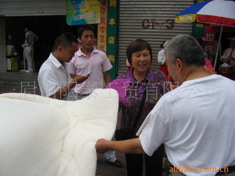 由眉山阳泰工贸有限公司通过自主研发**的眉三牌千层无网纯棉被,彻底克服了传统弹棉工艺中的不利因素,其工艺流程是首先选用**的新疆**棉花为原材料——经开松机开松、除杂——在精细弹花机上将每根纤维拉直、梳理杂乱并进一步除杂——获得高品质排列有序的纤维棉网——从收棉筒上得到平整度极高的棉卷——再根据标准制成规定重量,规定宽度和长度的棉胎,并在其棉胎内部加型线——在成形揉磨机上成形——收四边——在揉磨揉机上再揉磨——整形——检验包装。