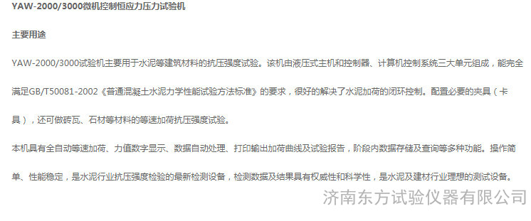 本网页所展示的有关【微机控制混凝土压力试验机YAW-2000/1000_压力试验机_济南东方试验仪器有限公司】的信息/图片/参数等由弹簧网的会员【济南东方试验仪器有限公司】提供,由弹簧网会员【济南东方试验仪器有限公司】自行对信息/图片/参数等的真实性、准确性和合法性负责,本平台(本网站)仅提供展示服务,请谨慎交易,因交易而产生的法律关系及法律纠纷由您自行协商解决,本平台(本网站)对此不承担任何责任。您在本网页可以浏览【微机控制混凝土压力试验机YAW-2000/1000_压力试验机_济南东方试验仪器有限公司】有关的信息/图片/价格等及提供【微机控制混凝土压力试验机YAW-2000/1000_压力试验机_济南东方试验仪器有限公司】的商家公司简介、联系方式等信息。