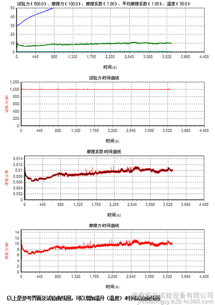 试验力的施加采用闭环伺服系统,其大小由操作者在计算机界面上设定、自动恒力控制,施力平稳、可靠、恒定,从而避免了试验力波动对试验结果的影响,该系统由伺服系统和调速系统来实现。该机的主轴转速、转数(试验周期)、试验力、摩擦力矩、摩擦系数、摩擦力、摩擦副温度、试验时间等参数均由计算机控制、实时采集试验数据并可绘制相应的试验曲线(如温度-时间曲线、摩擦力-时间曲线等),可任意存储、调阅、打印输出,数据真实可靠,无人为因素影响。