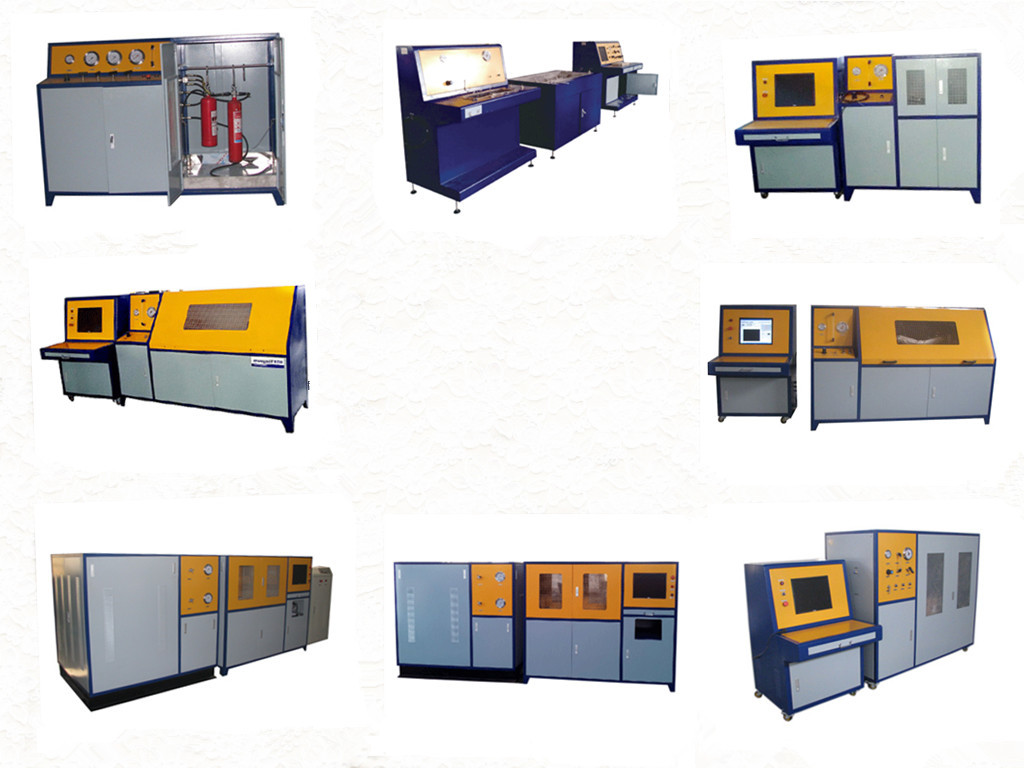 试验压力1~35Mpa,用于对灭火器、储罐、管道、连接件、压力容器的水压强度试验、爆破压力试验、变形量试验及出厂检测,本试验机采用SUP增压泵作为输出压力源,可进行升压-保压-升压-爆破的程序控制,并可设定多段保压平台,升压速率可设定,整个试验电脑全自动控制,也可以手动远程控制各个阀门,计算机自动生成压力、时间曲线,实时显示,并将各种数据存储,随时可打印出中英文检验报告。