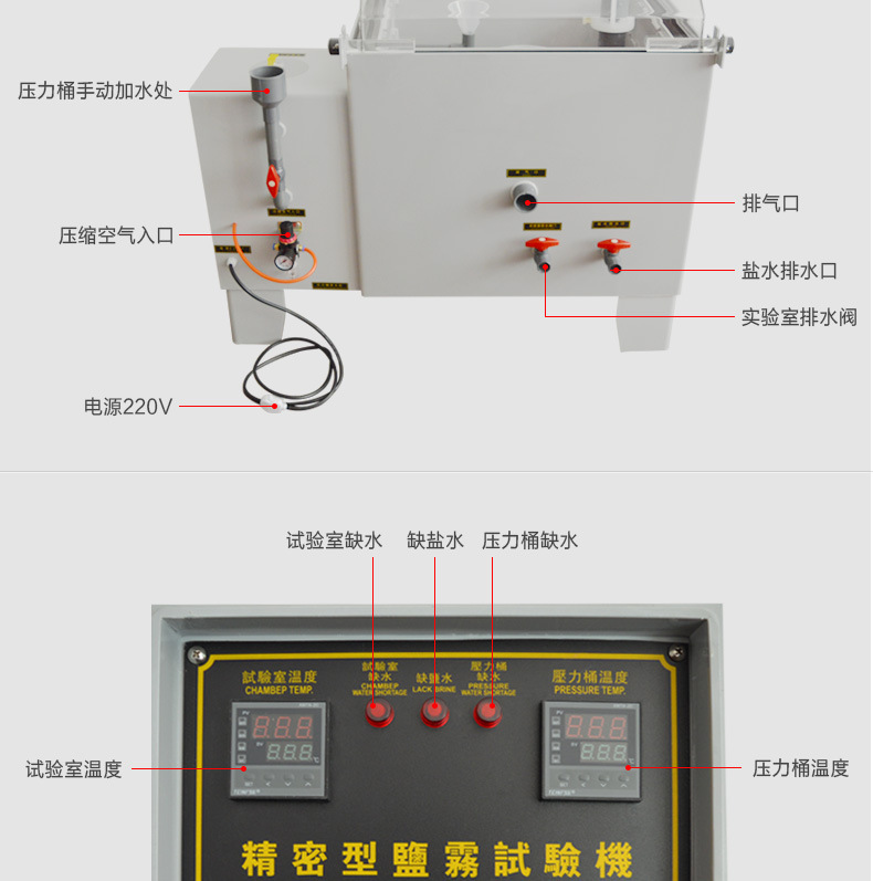 9、压力桶采用亨利定律,于以加温加湿,并提供盐雾腐蚀实验机试验室所需之湿度。