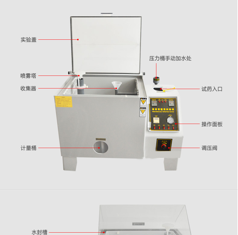 该盐雾腐蚀实验机可按GB/T2423.17《电子电工产品基本环境试验规程试验Ka:盐雾试验方法》做中性盐雾试验,同时也可做醋酸盐雾试验。