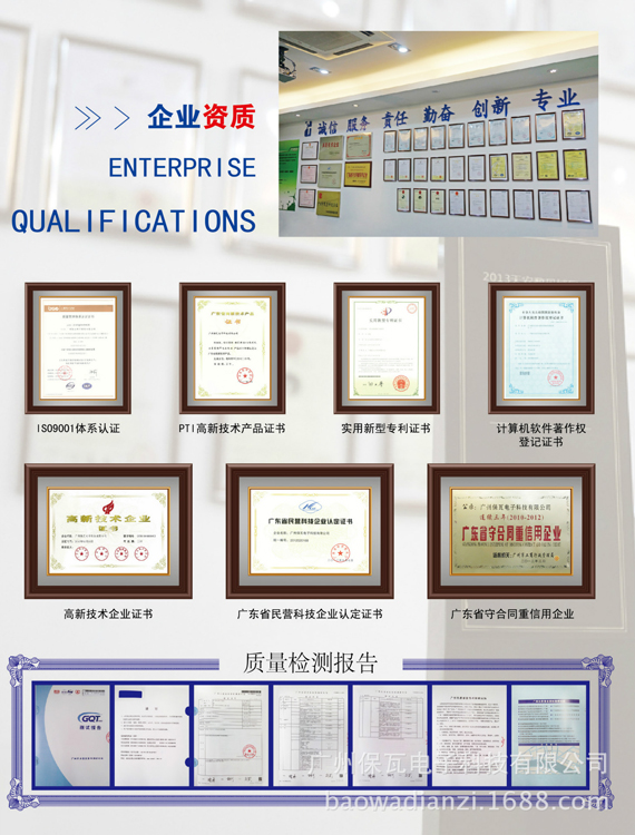 广州保瓦电子科技有限公司--连续十年荣获广东省守合同重信用企业--广东省高新技术企业--广东省民营科技企业--广州市科技创新小巨人企业--通过GB/T19001-2016/ISO9001:2005质量管理体系认证--拥有4个注册商标、7项广东省高新技术产品证书、16项保瓦计算机软件著作权登记证书