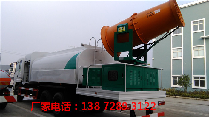 一体式雾炮抑尘车采用车底盘动力通过液压系统驱动雾炮,实现了大范围工作范围无极调速控制,按照实际需求分配动力,大幅降低能耗,减轻整车无效载荷,车载的射雾器可旋转320度,射程规格有40米、60米、80米、100米等。