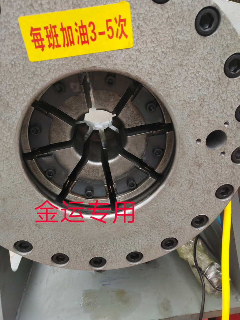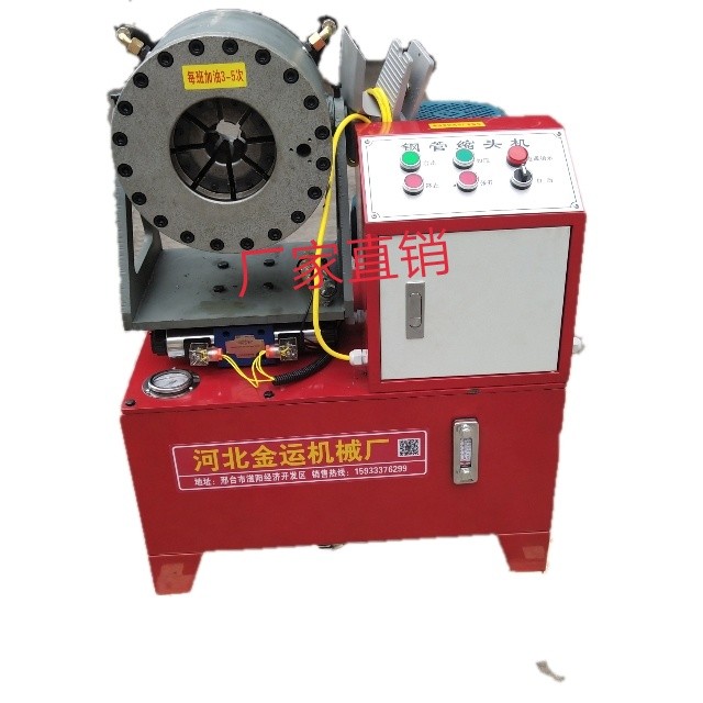 工作原理:油泵在电机驱动下,输出液压油,推动液压缸里的活塞做左右往复运动,从而使压块推动模座,使模座能产生径向收缩,最终实现模块对胶管(钢管)的扣压。当收缩量达到在控制面板上所设定的值时,扣压自动停止,换向阀自动换向,液压油进入油缸下腔,带动上方板向上运动,使模具孔张大**可以取下扣押好的胶管(钢管),缩管完成。