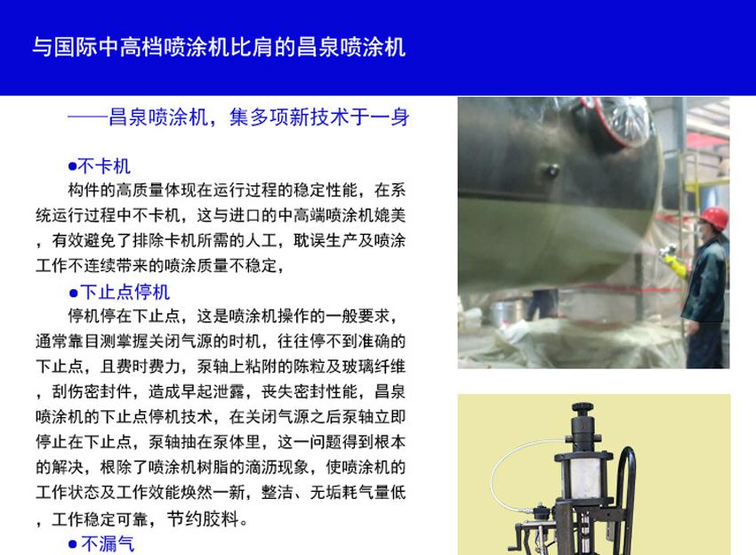 昌泉喷涂机是不卡机的喷涂机。工作时,不会因卡机而停机-死机。处理死机,一方面耗费人工(往往一个人专门 看护并处理),一方面耽误生产且影响产品质量,对有较高品味要求的玻璃钢产品(如双层罐等),生产中偶然停机,会破坏材质的连续性、均一性。昌泉喷涂机不卡机的特性,避免了生产中因卡机而停机,这一品质可与进口机媲美。