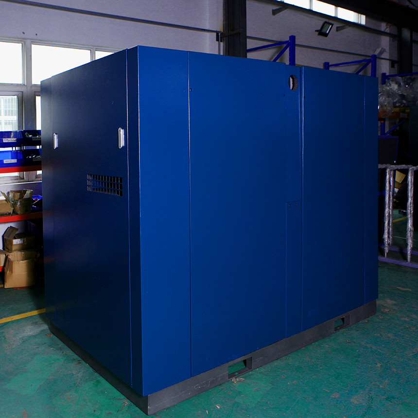 第二步:压缩后的空气进入冷通道,与大量油雾接触,从而大大降低其温度,降温后的压缩空气再进入第二级转子,进行二次压缩,被压缩到排气压力后通过排出口排出,完成整个压缩过程。