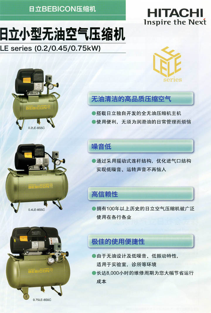 日立超级无油小型空压机LE标准系列现已在南京投产,我公司做为国内的一级代理商,我们恭候您的垂询。