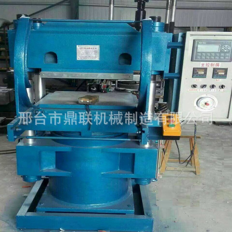 适用于压制各种模压制品,如压橡胶和塑料,也适用于薄片制品。本机床为四柱式整体结构,压制型式为下(向上)压式,分主机,油箱和电控箱三部分。主机装有柱 塞,油缸,固定平板,活动平板等部件。油箱有油泵,管道,阀等部件。油泵有电动机带动,电控箱装有按钮开关,磁力启动器,计时报警器,制动控温仪,过载保护器等。当电动机过载能自动切断电源,电加热由自动控温仪分三路控温,能在20-300度范围内任意调节,当达到温度后, 电路能自动保持恒温,达到设定的硫化时间后,自动报警,过程中自动排气,排气次数可设定,可自动进出磨具,自动开翻磨具。有广大客户需求的手动型、半自动型、全自动型。