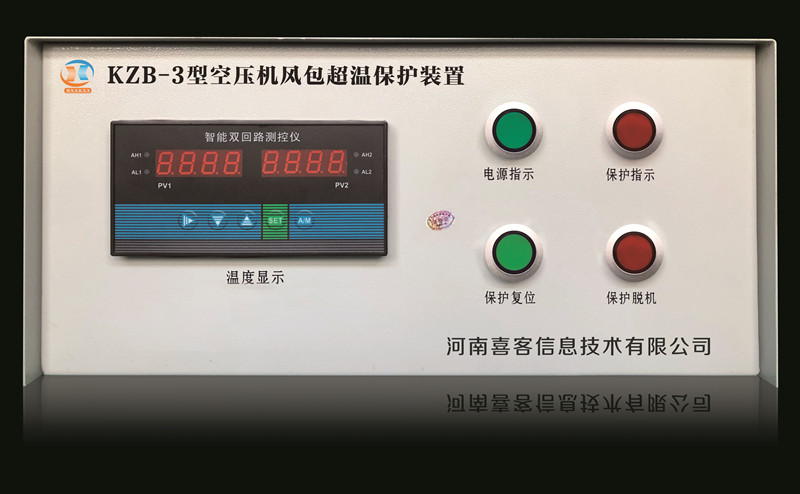 KZB-3型空压机储气罐(风包)超温保护装置通过对储气罐 (风包)温度信号的采集,实现对空压机和储气罐(风包)的超温保护。该装置主机由高精密度测控微处理器、数据存储器、输入、输出开关量接口及键盘等组成。测控微处理器分时检测、处理设备接口电路输入的数据信号,经过程序的数据处理,再输出至控制电路完成对空压机和储气罐(风包)的超温保护。数显风包温度检测点的温度超过温度设定值时,装置切断空压机急停回路,同时声、光报警。该装置抗干扰能力强,实用,可广泛应用于煤矿、冶金、矿山、化工等行业。