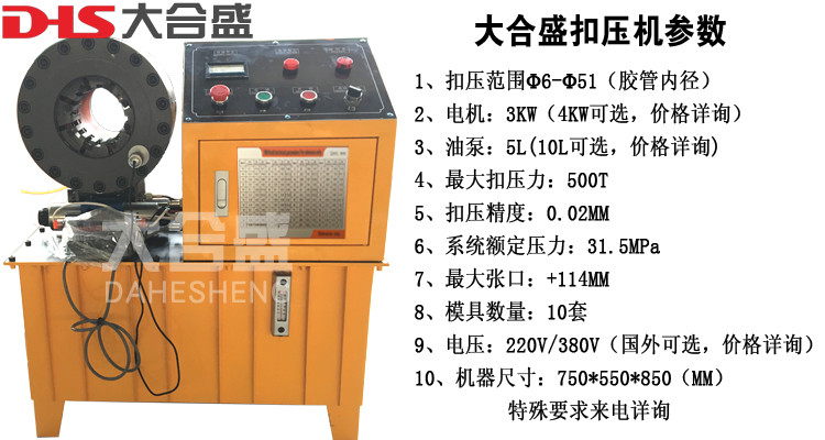 扣压机是一种用于扣压管件总成的液压设备其将所配套的金属接头通过压管机的模具施加收缩力,将金属接头牢固的扣压在所配套的工程机械用高压油管或汽车上的刹车管、机油管、空调管、动力管上。压管机适用于各类机械高低压油管、气管、水管、电缆接头、汽车空调管、汽车动力转向管、机油管、汽油供油管,以及建筑配件、日用热水气管的扣压,广泛用于车辆、工程机械、液压机械、焊割设备等行业。