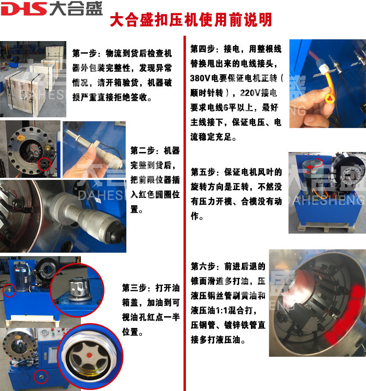 3.机器初次使用时应空扣压10~20次,观察各部位均正常后方可使用。锁管机在冬季使用时应空载运动20-30次,以使油温增高一些,同时可增加机器的使用寿命。