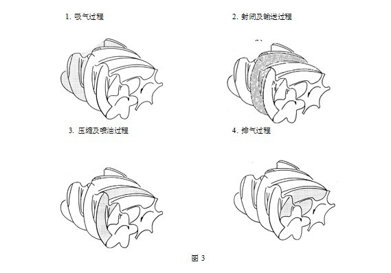 在输送过程中,随着转子的旋转,齿间容积由于转子齿的啮合而不断减小,齿间容积内之气体体积也随之减小,气体被压缩,压力升高,此即“压缩过程”。压缩的同时,润滑油因压力差而喷入齿沟内与空气混合。
