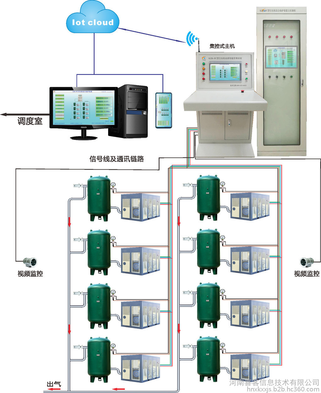 系统在线监测多台空压机的运行状态,包括工作压力(包括空压机排气压力、风包压力、冷却油压力)、温度(包括风包温度)以及其他电气参数(包括电机电流、电压、功率、电量等),油压(包括润滑油路、过滤器等)、油位、有害气体含量、外部环境烟雾报警等,可控制多台空压机的远程启动和停止。