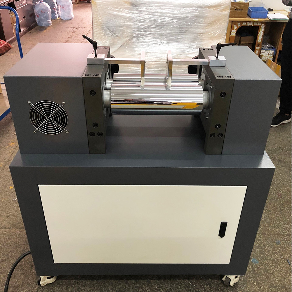 由相同大小的滚轮,按照一定的速率相对旋转,以及其内部发热丝所产生的温度,辗压原料。