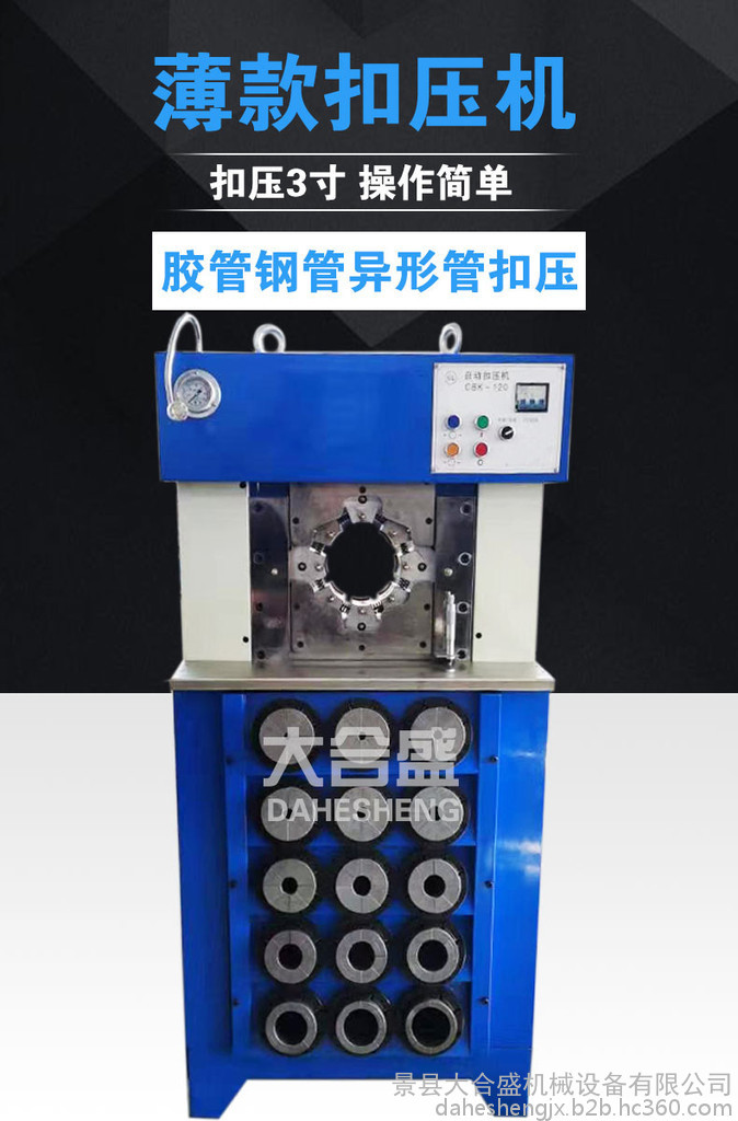 本网页所展示的有关【河北大合盛 CBK120超薄扣压机 扣压机 高压软管扣管机 软管压管机 缩管机 钢管扣管机 钢管锁管机_强压机_景县大合盛机械设备有限公司】的信息/图片/参数等由弹簧网的会员【景县大合盛机械设备有限公司】提供,由弹簧网会员【景县大合盛机械设备有限公司】自行对信息/图片/参数等的真实性、准确性和合法性负责,本平台(本网站)仅提供展示服务,请谨慎交易,因交易而产生的法律关系及法律纠纷由您自行协商解决,本平台(本网站)对此不承担任何责任。您在本网页可以浏览【河北大合盛 CBK120超薄扣压机 扣压机 高压软管扣管机 软管压管机 缩管机 钢管扣管机 钢管锁管机_强压机_景县大合盛机械设备有限公司】有关的信息/图片/价格等及提供【河北大合盛 CBK120超薄扣压机 扣压机 高压软管扣管机 软管压管机 缩管机 钢管扣管机 钢管锁管机_强压机_景县大合盛机械设备有限公司】的商家公司简介、联系方式等信息。