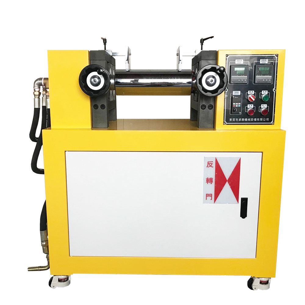 由相同大小的滚轮,按照一定的速率相对旋转,以及其内部发热丝所产生的温度,辗压原料。