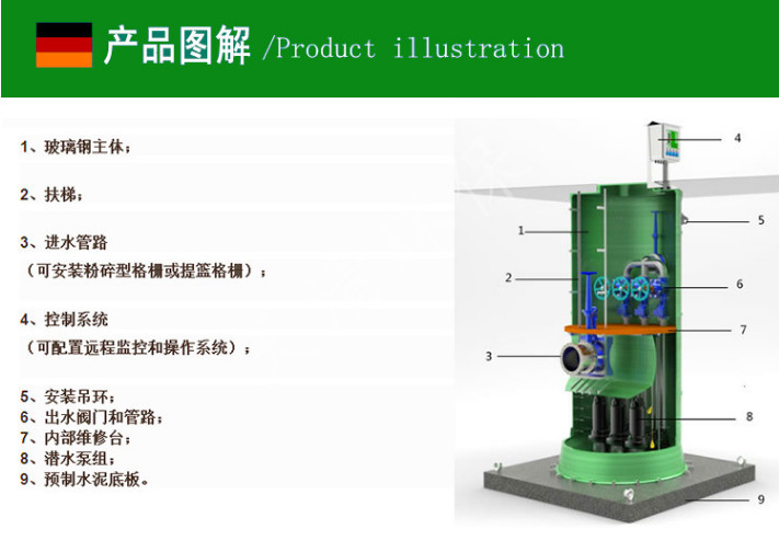 一体化预制泵站是一种集潜水泵、泵站设备、除污格栅设备、控制系统及远程监控系统集成的一体化的产品。其特点具有机动灵活、适应性强、寿命长、建设周期极短,安装极其简便等传统泵站不具备的优点,可用于生活污水、雨水、工业废水排放,也可用于水源取水,是新一代的绿色科技产品。