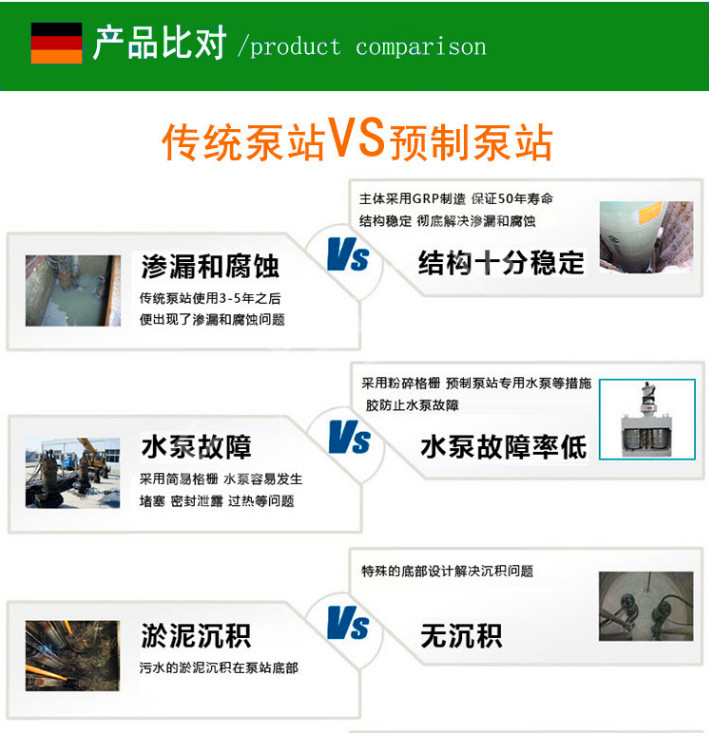 3、预制泵站所使用潜水排污泵均为高质量潜水切割泵,能在恶劣的污水环境下稳定运行。同时,所有的污水泵均使用大通道及带切割的叶轮,拥有良好的杂质的通过性,降低水泵堵塞的风险。