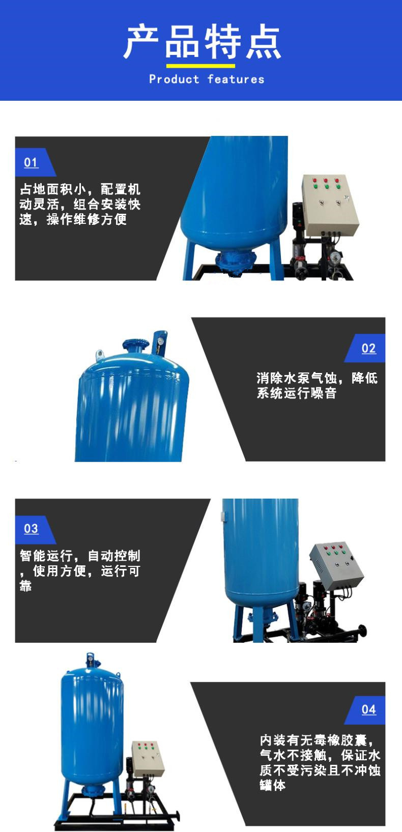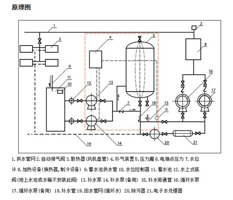 补水定压装置设备采用系统静压作为膨胀水箱内的设计初始压力水头,采用保证系统内热水不汽化的压力作为膨胀水箱内动行终端压力水头。初始运行时首先启动补水泵向系统及气压罐内的水室中充水,系统充满后多余的水被挤进胶囊内。因为水的不可压缩性,随着水量的不断增加,水室的体积也不断的扩大而压缩气室,罐内的压力也不断的升高。当压力达到设计压力时,通过压力控制器使补水泵关闭。当系统内的水受热膨胀使系统压力升高超过设计压力时,多余的水通过阀排到补水箱循环使用,当系统中的水由于泄露或温度下降而体积缩小,系统压力下降时,胶囊中的水被不断压入管网补充系统的压降损失,当系统压力到设计允许的低压力时,通过压力控制器使补水泵重新启动向管网及气压罐内补水,如此周而复始。