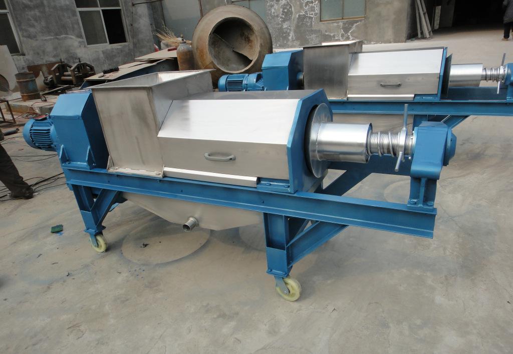 双螺旋压榨机为可连续式双螺旋压榨机,本机用于含有一定纤维质或有粘性的其宏观世界物料的固液分离作业.如发酵后的葡萄皮渣、生姜、菠菜、橡胶、中草药、冬枣等含一定纤维的水果和蔬菜提汁,也用于除过枝或含少量小枝的沙棘果的连续榨汁,其筛孔专门按沙棘子的大小特殊制造的。