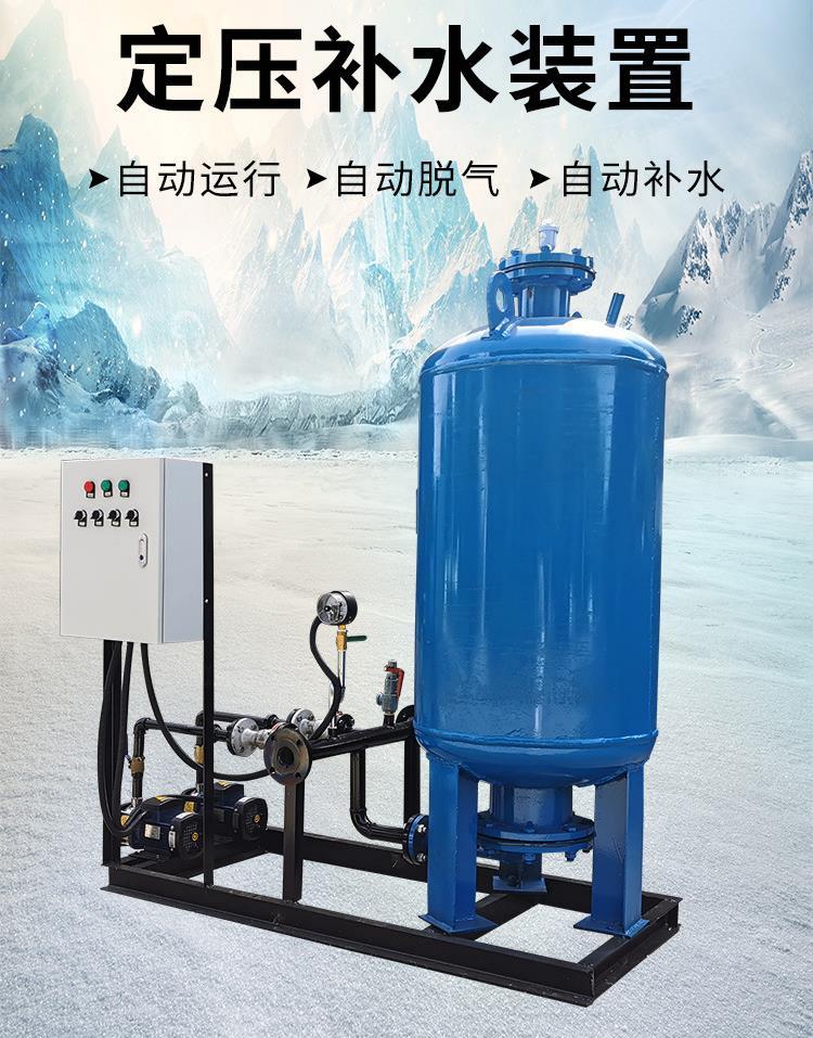 设备工作原理 定压补水装置利用气压罐的可调节能力,可自动调节用户水量的变化,当用水量减少或不用水时,可较长时间不启动水泵,达到节能目的。 与水塔、高位水箱相比可节省投资约40%-60%。该设备结构紧凑,与其他传统的供水装置相比减少了占地面积, 节省了土地资源。本设备全自动运行,无需专人管理,工作可靠。 同时在水循环系统中:一方面存在大量气体,如果不加以脱除容易产生气阻,造成局部或整个系统的循环不畅且冷热不均,以及设备和管道的损坏;另一方面水中含有的氧气使得 供热(制冷)设备、管道和钢制散热器等末端设备腐蚀,穿孔、漏水直接影响到整个系统的。该机组中的脱气设备根据享利定律即:在一定温度及压力下水中溶解一定数量的气体,当温度增加或压力下降时,水中溶解气体将会减少的原理;在不改变水温的情况下通过设备产生真空,将水中的游离气体和溶解气体释放出来, 再通过自动排气阀排出系统。脱气后的不饱和水将吸收系统中的气体寻求气水平衡。如此循环,从而脱除系统水中所有气体,确保系统稳定运转。