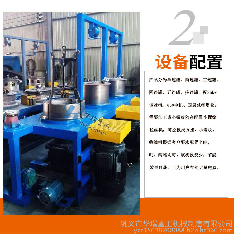 华瑞重工厂家是一个生产各种拉丝机及辅机专业厂家。并可根据用户需要制造各种非标、特殊规格等产品。主要产品 有倒立式拉丝机,卧式拉丝机,弹簧钢丝生产线,不锈钢丝生产线,低碳光亮丝生产线,铜铝丝生产线,直条冷拔机等二 十多个品种。