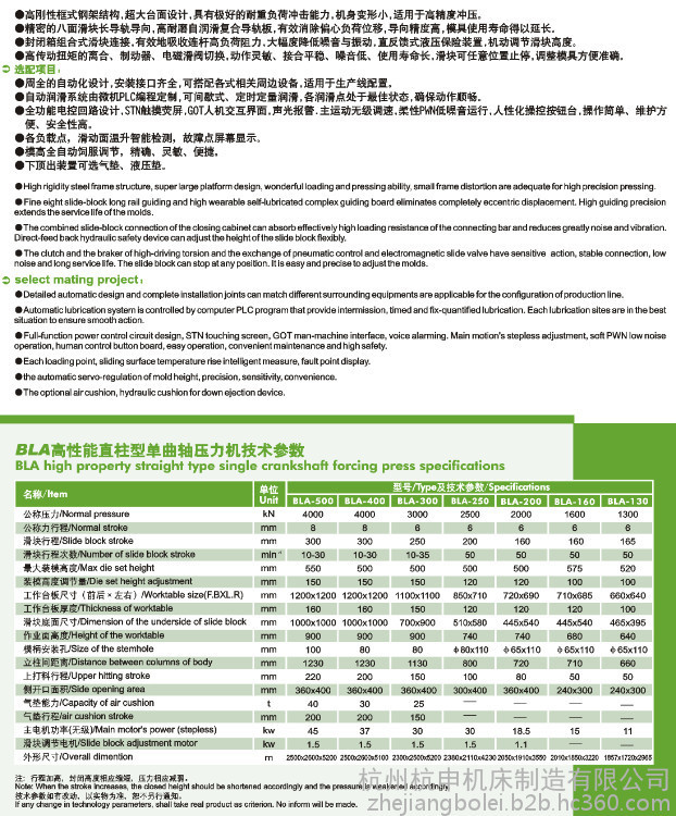 公司生产的BLA系列冲床规格有:BLA-130,BLA-160,BLA-200,BLA-250,BLA-300,BLA-400,BLA-500