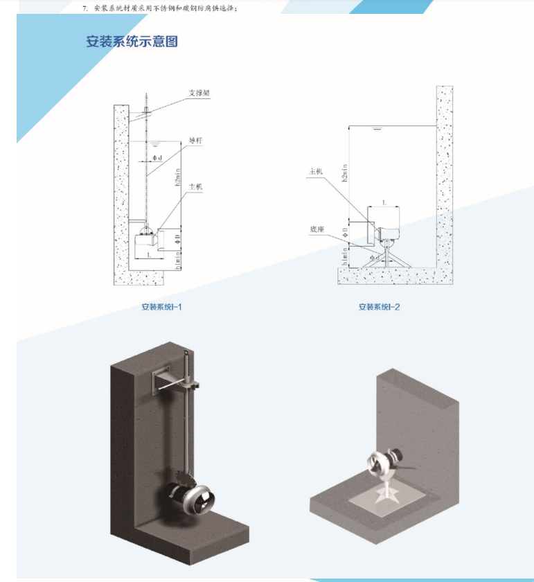潜水搅拌器在污水池内的安装位置很重要,安装位置不同,污水池内搅拌效果明显不同。有时候,用小功率小直径的潜水搅拌机**可以达到搅拌效果,但由于错误的安装位置,可能导致小功率潜水搅拌机达不到搅拌效果,而被迫更换大功率的潜水搅拌机,这往往造成浪费。有时候,某个角度安装时,水池内搅拌效果差,但稍微调整一下潜水搅拌机的安装角度,水池内流体可能马上形成良好的循环,池内流体得到充分的搅拌。有时候,一个大功率的潜水搅拌机打不到搅拌要求,但换两个小功率的潜水搅拌机,安装在合适的位置上,立刻**达到了搅拌要求。