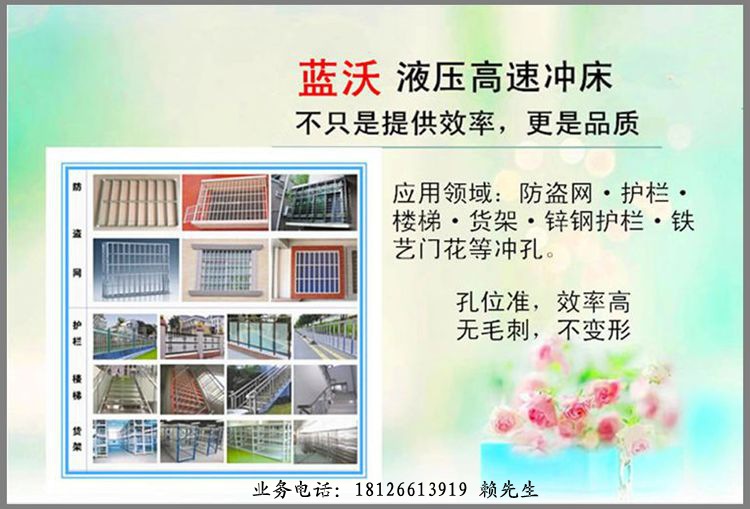 广泛应用于不锈钢防盗网、楼梯扶手、护栏、货架、各类鞋架、衣架、不锈钢管(圆管、方管)、锌钢、彩钢、铁管、铝合金等冲孔,护栏枪尖一次冲压成型,圆管冲弧口一次成型。可根据客户需求定做多个工位的冲床,整机自带定位杆刻度尺,定位精准,冲口平整,可任意调节对穿孔、单面孔,是护栏、货架厂和做防盗网的好帮手。