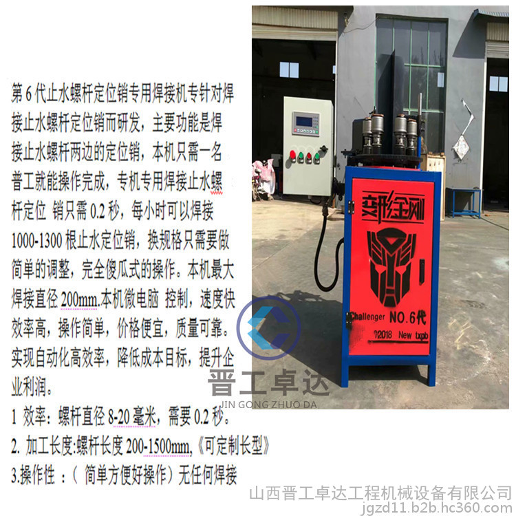 止水螺杆专用焊接机专针对焊接止水螺杆定位销而研发,主要功能是焊接止水螺杆两边的定位销,本机只需一名普工**能操作完成,专机专用焊接止水螺杆定位销只需0.2秒,每小时可以焊接1000-1300根止水定位销,换规格只需要做简单的调整,完全傻瓜式的操作。本机**焊接直径200mm.本机微电脑控制,速度快,操作简单。
