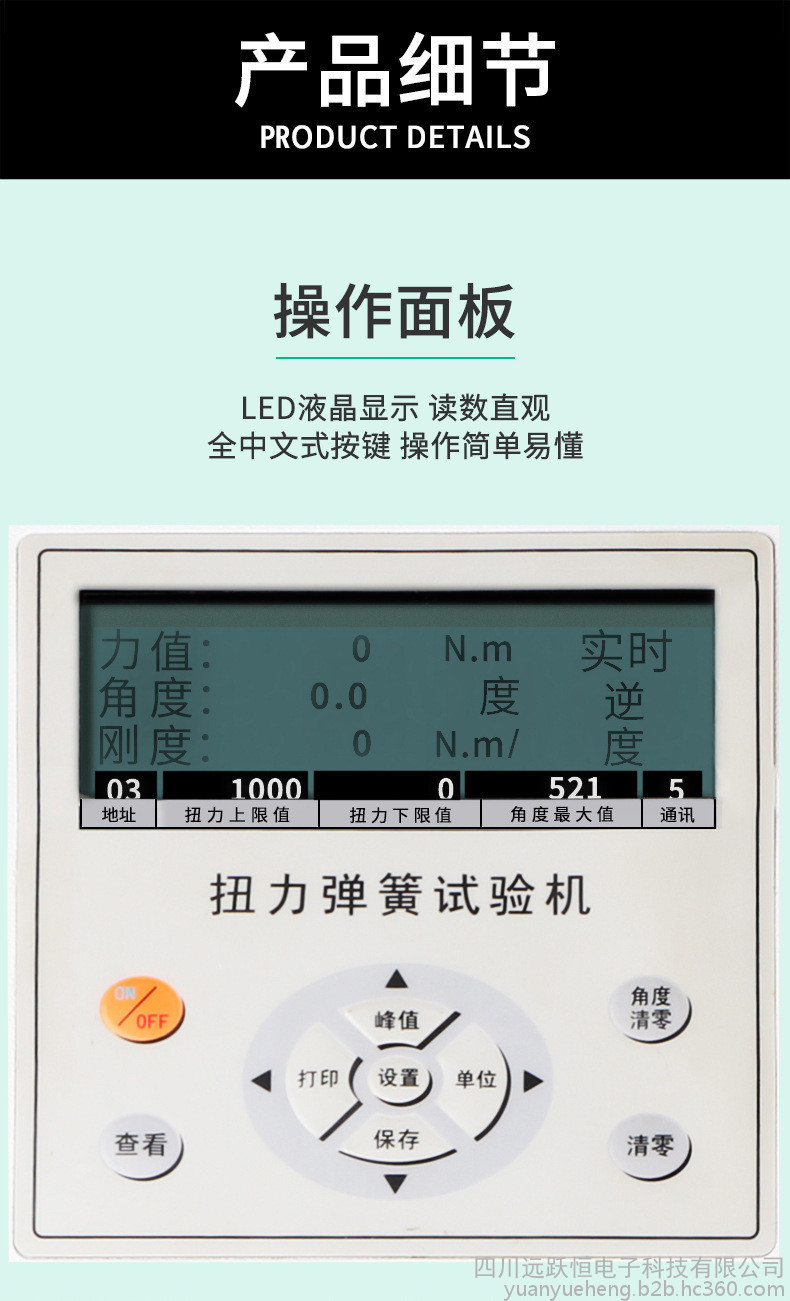 四川远跃恒是一家0.2-2N.m扭转弹簧试验机厂家,本司生产的扭转弹簧试验机是测试拉伸和压缩弹簧的变形量和负荷关系特性的专用仪器,适用拉伸和压缩弹簧的一定工作长度下的工作负荷测试,也可用于橡胶等弹性器件的弹力负荷测试,采用先进的、高集成度的一体化单片机,和中文液晶显示,外型采用金属外壳,极大的提高了系统的抗干扰能力。