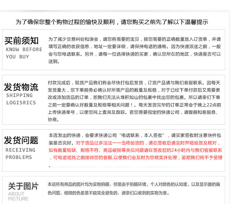 | 特别提示 本店专注于生产、加工、订制。利薄、量少的强力推荐直接下单,更详细的订制批发需知请点击>>>批发必读<<< 上班时间为周一至周六,上午8:30-下午18:00,晚上20:00-23:00(晚上不处理售后)着急的客户可以致电联系以下的工作人员。 移动电话:13669820589 程小姐 |